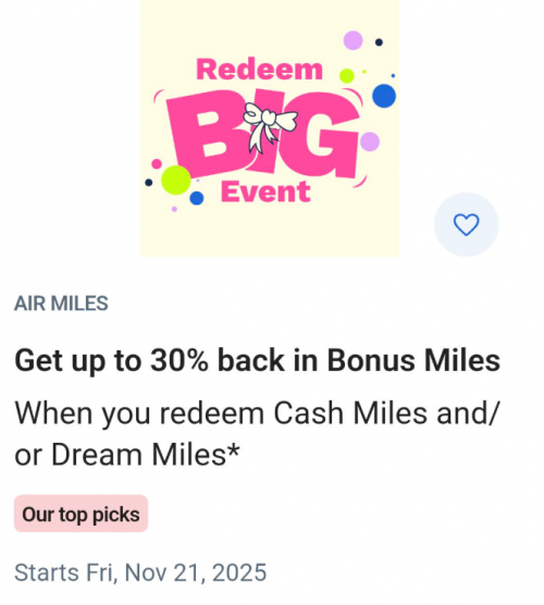 The Reedem Big Event is coming up at Air Miles Canada, and starting Friday, November the 21st you can get 30% back in Bonus Miles when you redeem Cash Mile and/or Dream Miles. Head over to your account and opt-in to the promotion before it starts.