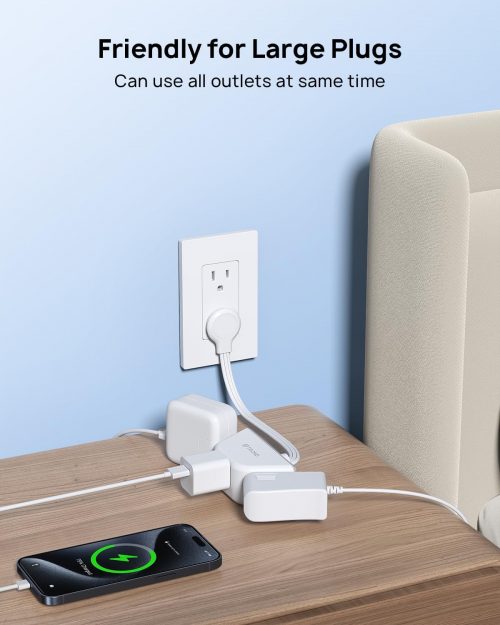 • Patented Right Angle Flat Wall Plug: The 0.33″ low-profile thin plug fits easily into tight spaces and blends into the wall for enhanced aesthetics. Ideal for behind TVs, bed frames, dressers, cabinets, bedside table and sliding doors, its vertical plug head ensures easy access to bottom outlets for maximum convenience