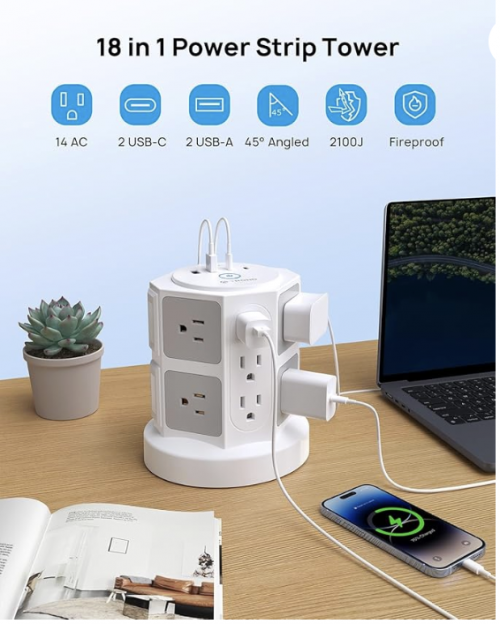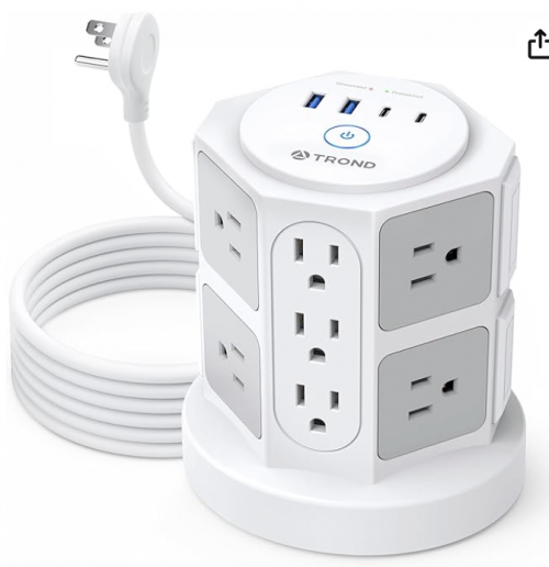 Click here to Save 40% on TROND Tower Power Bar Surge Protector with USB C, 14 Widely Spaced Outlets, 10ft Flat Plug