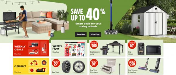 Save up to 40% on smart deals for your Spring refresh at Canadian Tire. Save up to $200 on backyard living, up to 40% on kitchen items, up to 25% off tires, up to 50% off shop tools and hardware, up to $250 off vacuums and floor care, and more. Here are some of the weekly deals available now at Canadian Tire: