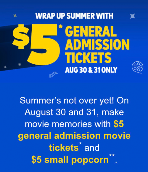 The last weekend of the summer is nearly here, and you can head to Cineplex and catch a movie for just $5! This August the 30th and the 31st, get general admission tickets for just $5, and a small popcorn will also be just $5.