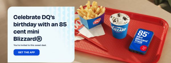 In celebration of their 85th anniversary, Dairy Queen Canada is offering mini Blizzards for just 85 cents for a limited time. This offer is valid for DQ Rewards members until October the 26th with a purchase of $1 or more. This offer can be redeemed in the app or online.