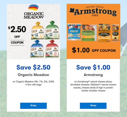 Every so often there are new coupons available through Dairy Farmers of Ontario portal, and right now there are two coupons available that you can print. The first coupon is for $2.50 off the purchase of Organic Meadow 0%, 1%, 2%, or 3.8% 4 litre milk bags, and the second coupon is for $1 off the purchase of Armstrong Natural Cheese Slices, Shredded Cheeses, Nibblers, Natural Cheese Snacks, Cheese Sticks, and High in Protein Marble Cheddar Cheese.