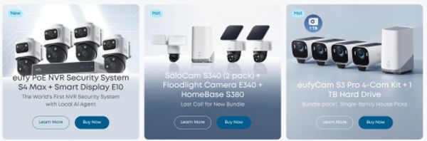 - eufyCam S3 Pro 4-Cam Kit + 1 TB Hard Drive $697.99 (reg. $1,199.99)