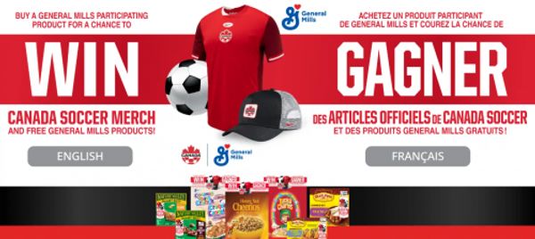 General Mills Canada has a great new promotion that gives you the chance to win soccer merchandise, and gives you free General Mills product coupons just for entering. Buy any participating product and upload your receipt for the chance to win 1 of 2,500 daily prize packs, and 1 of 3 grand prizes of a signed Canada soccer jersey. The first 30,000 valid entries will also receive coupons for free General Mills products by mail.
