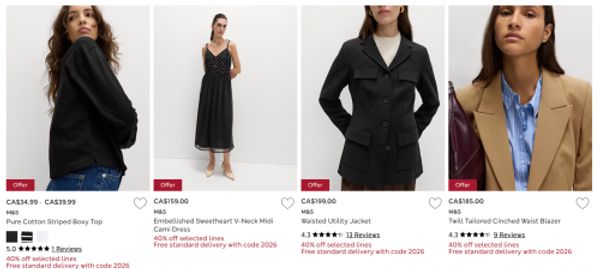 Shop the Winter Sale at Marks & Spencer Canada, and for a limited time save up to 40% off select lines. There is savings of 20% on kidswear, 20% on lingerie, and up to 40% off styles for men and women. Free Standard shipping is also available, and to get this offer you can enter the code 2026 at checkout. Here are some of the styles for women that are currently 40% off in your cart: