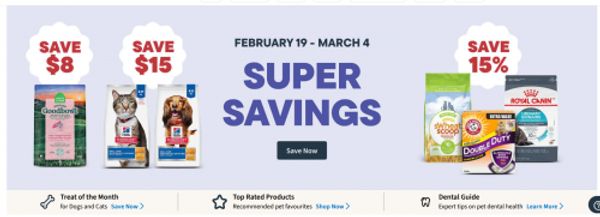 There is a Super Savings sale on now at Pet Valu Canada, and there are savings on cat food, dog food and treats, dental care products, litter, and much more. All prices are as marked, and sale prices are valid until March the 4th. Save up to $8 on dog food, up to $15 on cat food, up to 25% on dog treats, up to 15% on dental health, up to 15% on litter and accessories, and get 20% off dog and cat toys. Shipping is free on orders of $49 or more, and here are some of the markdowns: