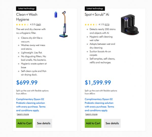 - Spot + Scrub Ai $1,599.99 (complimentary Dyson 02 Probiotic cleaning solution with every purchase)