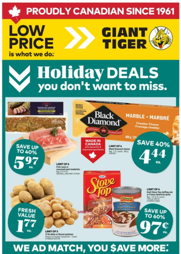 Get set for the holidays with some great deals at Giant Tiger that are valid from December the 10th to the 16th. Stove Top stuffing is just 97 cents, which will probably be the lowest price you’ll find for this item. If you can’t make it to Giant Tiger this week you can use this ad to price match. Here are some of the other deals that start tomorrow at Giant Tiger: