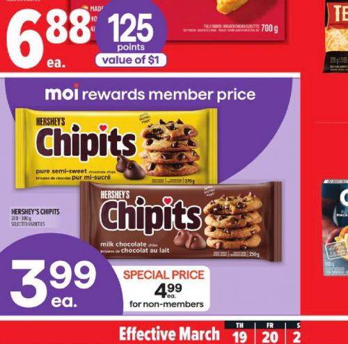 Metro Ontario has a great deals on Hershey Chipits this week for Moi rewards member. If you are a member you can scan your app at the checkout and pay just $3.99 for a bag. For non-members the price is $4.99. If you need a large quantity of chocolate chips, the large bag of Kirkland chocolate chips recently come down in price from $39.99 to $29.99.
