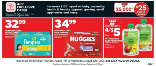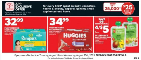 Starting this Thursday, August the 14th, and until Wednesday, August the 20th, you can earn 25,000 PC Optimum points for every $100 that you spend on baby, cosmetics, health & beauty, apparel, gaming, small appliances, and home at Loblaws and Real Canadian Superstore. This offer will appear in your app with your other new offer this Thursday. The flyer will be available later this week, but for now here are some of the offers valid at Real Canadian Superstore until Wednesday of this week: