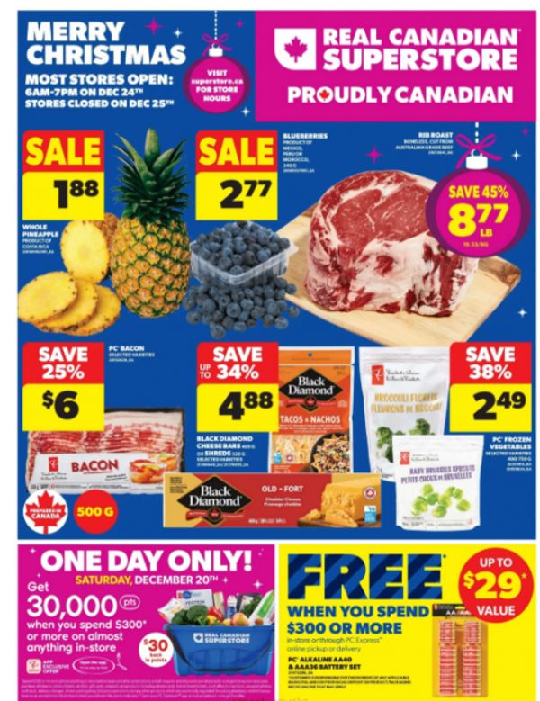 This Saturday, December the 20th only, get 30,000 PC Optimum points when you spend $300 or more in-store only at Real Canadian Superstore. This is an app exclusive offer, and it should apply automatically to your purchase when the required amount is spent. You are able to use coupons to bring down your total spend, and you can also redeem points in your transaction, and you will still earn the 30,000 points. Here are some of the deals in the Superstore flyer that starts tomorrow: