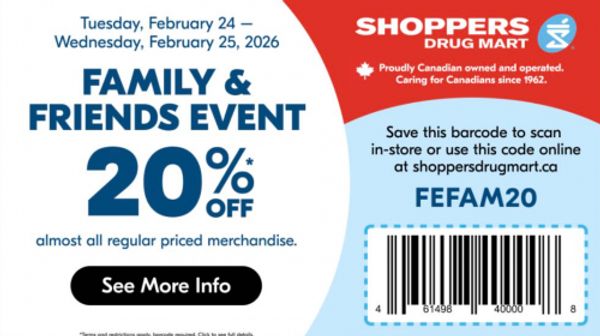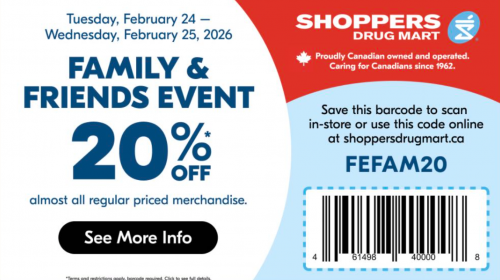 Shoppers Drug Mart Canada is having a Family & Friends Event this Tuesday, February the 24th, and Wednesday, February the 25th. On both days you can save 20% on regular priced items when you scan the bar code. There is a list of restrictions, so be sure to refer to the offer in your app for full details. This will replace the typical text offer for Tuesday and Wednesday, so you may want to make use of your weekend offer and shop Saturday or Sunday instead. Sale items will not qualify for the 20% off, but here are some of the advertised deals at Shoppers Drug Mart this week: