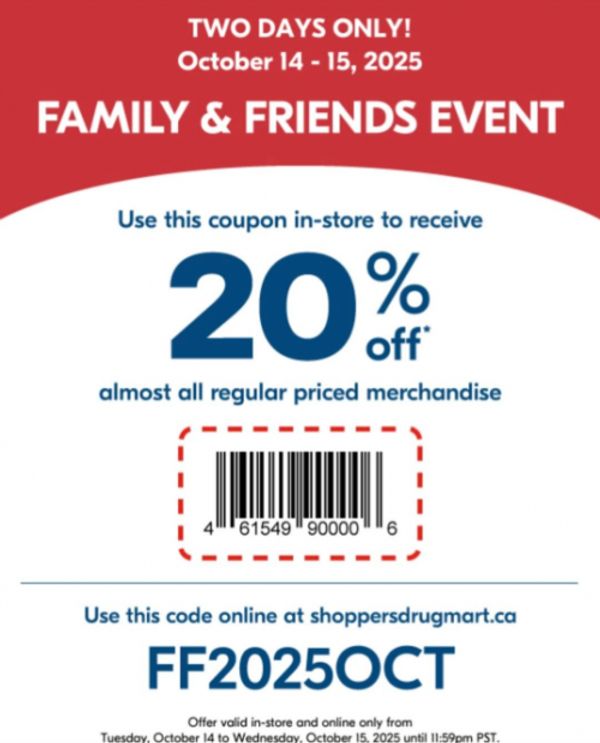 A Family & Friends Event begins tomorrow at Shoppers Drug Mart Canada, and you can save 20% off your purchase. Check your app for the offer or use the bar code pictured to save 20% off your purchase of most regular priced items on October the 14th and 15th. You can use the offer as many times as you’d like over the two days, and you can check you app for the full list of exclusions. Although sale items are not included, here are some of this week’s deals at Shoppers Drug Mart Canada: