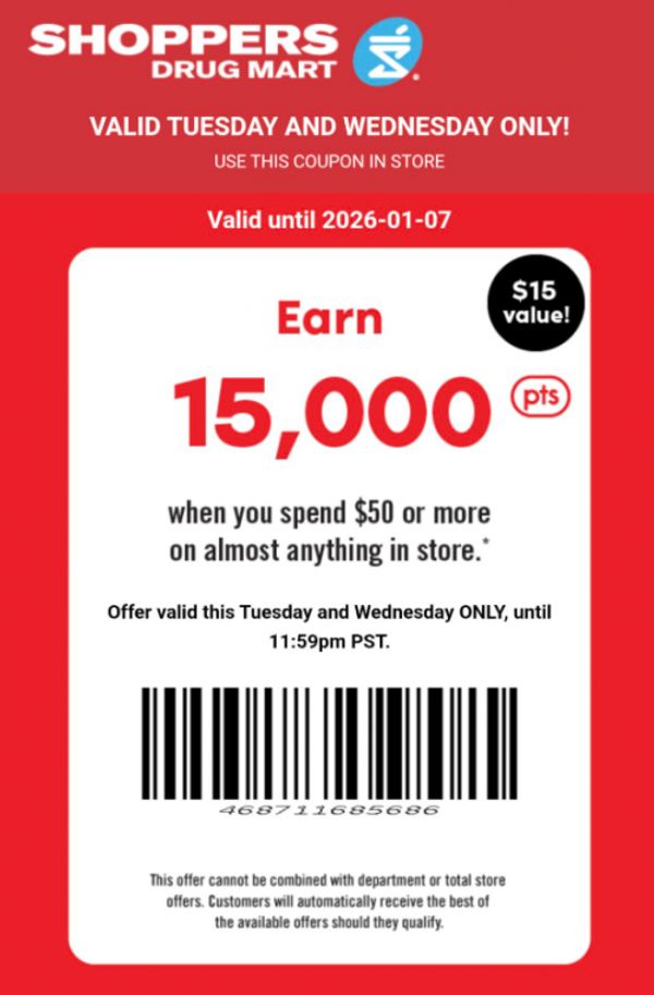 New text offers were sent out today from Shoppers Drug Mart Canada, and you may have received an offer. If you did not, you can use this offer for 15,000 PC Optimum points when you spend $50 or more. This offer is valid for two days, Tuesday, January the 6th, and Wednesday, January the 7th. To use the offer, simply scan the bar code in addition to your PC Optimum card. Here are some of the deals this week from the Shopper’s Drug Mart Canada flyer: