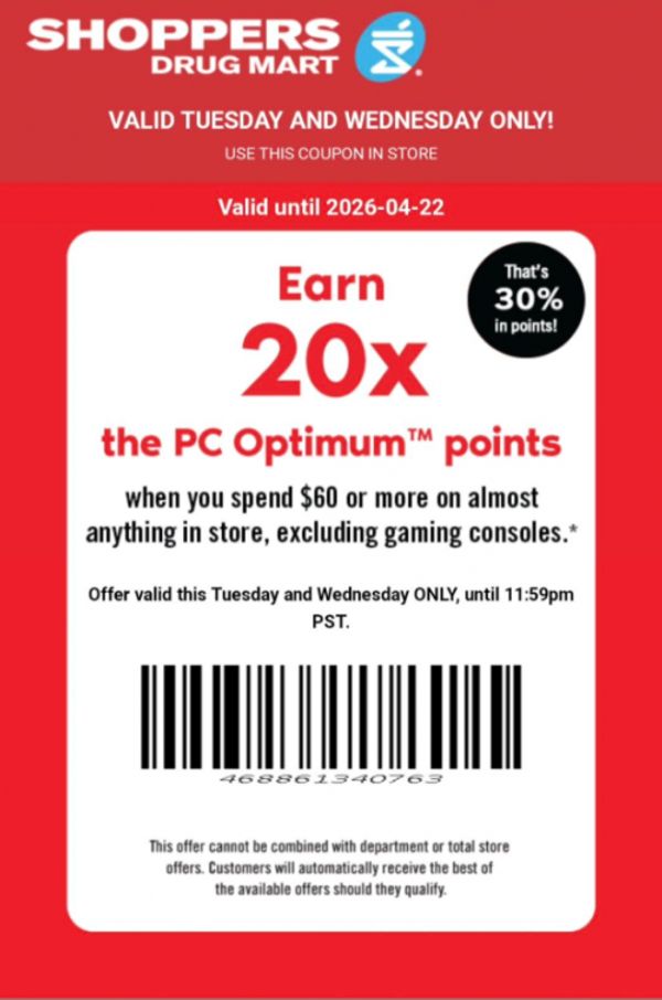 Text offers for this week have been sent out by Shoppers Drug Mart Canada, and here is an offer that you can use to earn 20x the PC Optimum points when you spend $60 or more on nearly anything in store on Tuesday, April the 21st, and Wednesday, April the 22nd. Scan this offer in addition to your PC Optimum card, and you should see the points on your receipt. Here are some of the deals this week at Shoppers Drug Mart: