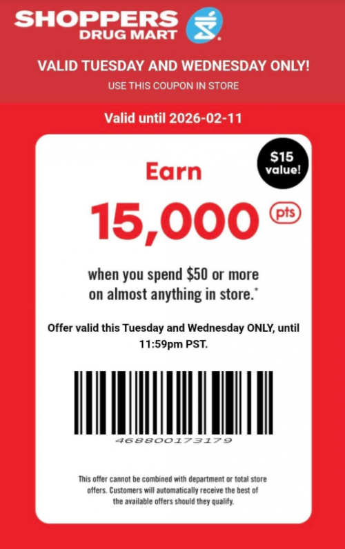 Get 15,000 PC Optimum points at Shoppers Drug Mart Canada when you spend $50 or more on nearly anything in the store and present this text offer. There has been talk of fraudulent text offers being circulated where the bar code had been altered, but rest assured this offer is safe to use and is valid through the end of today. If you’ll be making use of this offer, here are some of the deals from the flyer that is currently valid at Shoppers Drug Mart: