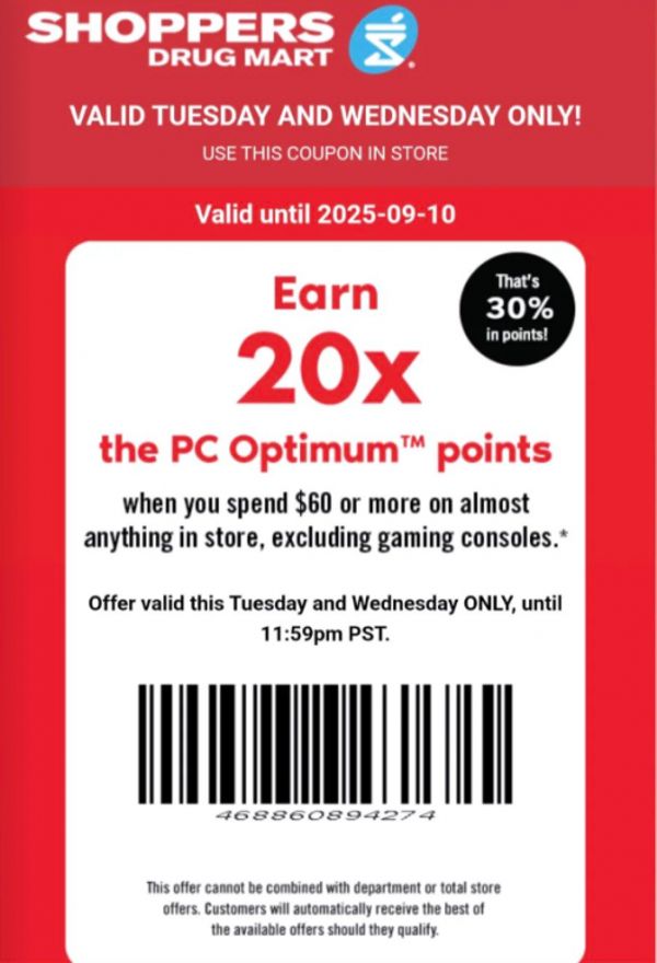 Shoppers Drug Mart Canada has sent out a new text offer to those who are subscribed. There are different variations of this offer that are sent out, but here is one that you can use to earn 20x the PC Optimum points when you spend $60 or more. This offer is valid on almost anything in on September the 9th and 10th, with the exclusion of gaming consoles and the usual items like gift cards, etc. Here are some of the deals from this week’s Shoppers Drug Mart Canada flyer: