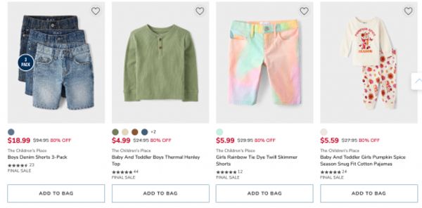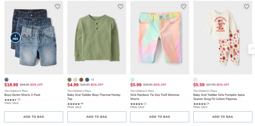 Get savings of 50-80% off everything at The Children’s Place and Gymboree Canada. There are jeans starting at $12.99, graphic tees from $4.99, active styles from 50-60% off, and clearance is now 80% off. Shipping is free on orders of $40, or if you use the store pick up option you can save an extra 15% on your order of $30 or more. Here are some of the savings up to 80% off on clearance styles: