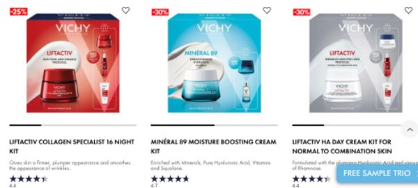 For a limited time Vichy Canada has 20% off sitewide, and this discount will be automatically applied in your cart. There are also select excess stock items available, and they are now up to 30% off. You can enter your email to sign up and receive a free sample trio with your first order, and shipping is free on orders of $50 or more. Here are some of the markdowns up to 30% off at Vichy Canada: