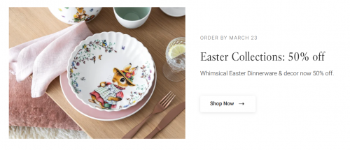 Everything is up to 50% off sitewide at Villeroy & Boch Canada, and Easter dinnerware and decor is now 50% off. The Manoir and Petite Fleur Collections are the pattern of the month for February, and these pieces are also 50% off. If you are ordering pieces from Easter collections, be sure to place your order by March the 23rd. Shipping is free on orders of $250 or more, and there is a $20 fee for orders less than $250. Here are some of the Easter Collection pieces that are now 50% off: