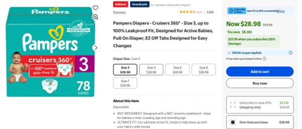 You can get a considerable discount on a box of Pampers 360 Cruisers or Swaddlers online only at Walmart Canada, using a coupon that will find in your account for $10 off, and setting up Subscribe & Save for an additional 20% savings.